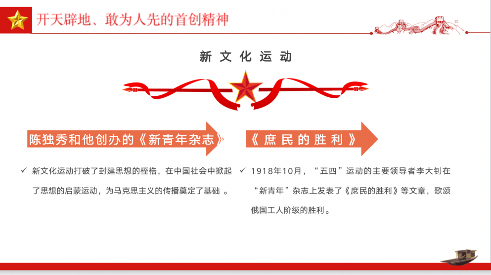 第一部分是开天辟地、敢为人先的首创精神是红船精神的核心是党和人民事业发展的动力,在中国共产党创始人的建党实践和革命活动中,从播撒中国革命的思想火种,到奠基中国工人阶级的先锋组织;从制定彻底反帝反封建的民主革命纲领,到开创中国革命的新局面,无不彰显了开天辟地、敢为人先的首创精神。